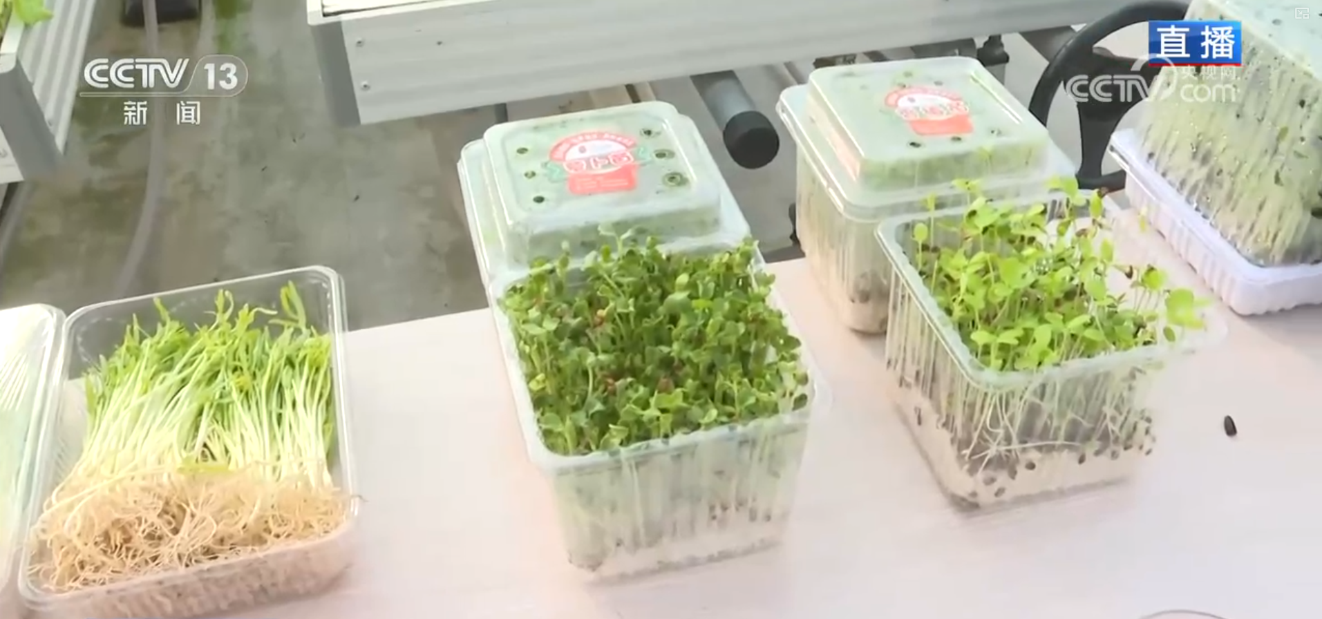 年产量是简略单纯大棚的5倍摆布。定制光谱设备让芽苗菜正在发展全周期获得适宜光照,还有正在架子上长的盒拆芽苗菜,这些净菜能够即烹即食。去掉蔬菜不成食用的部门,